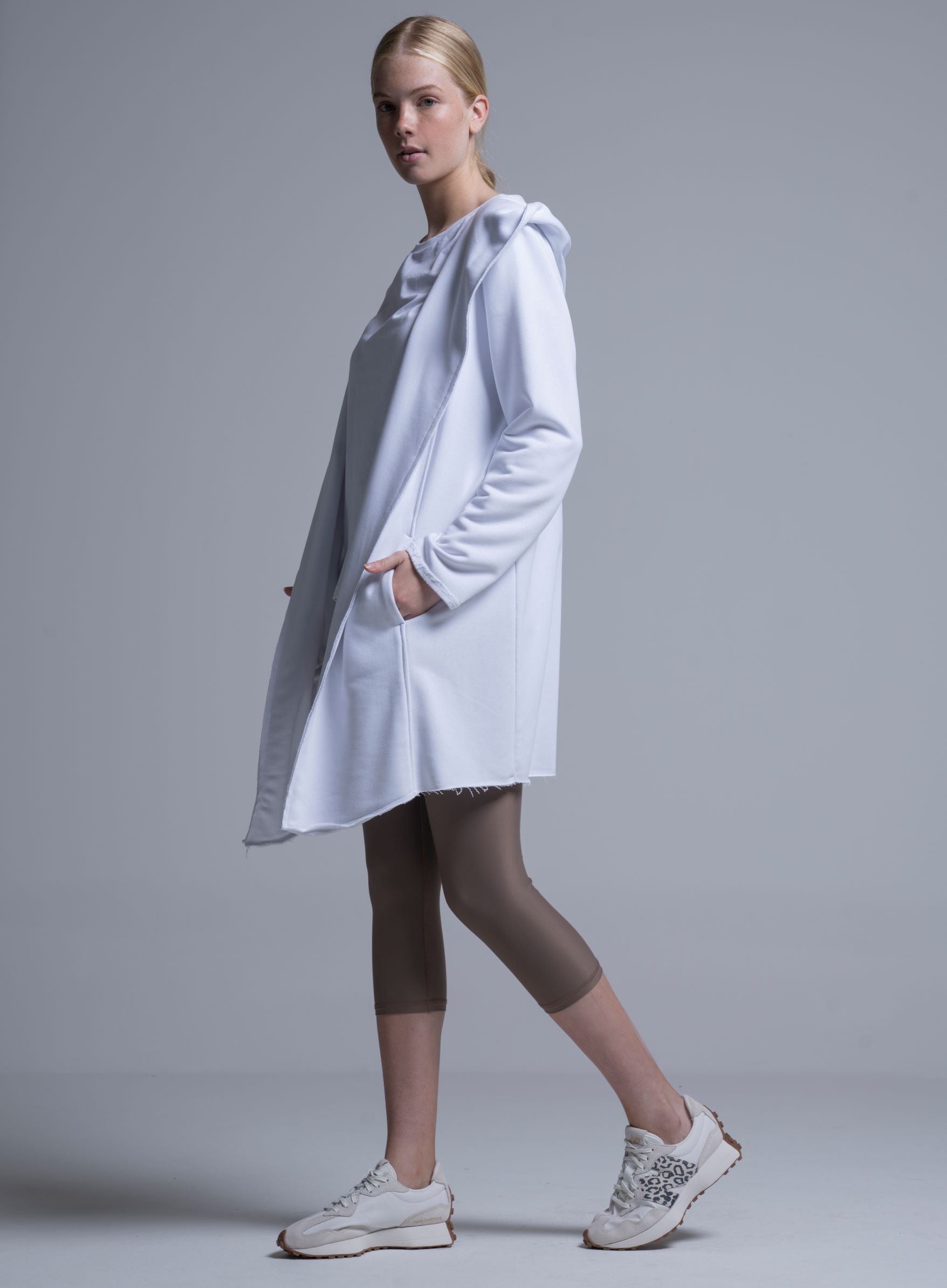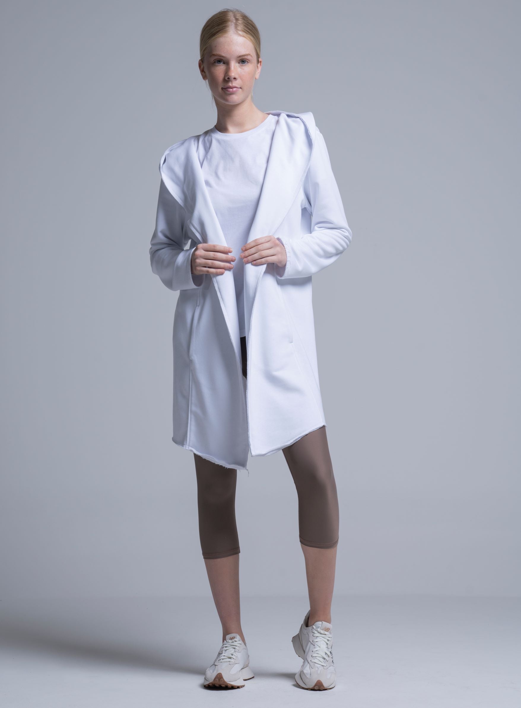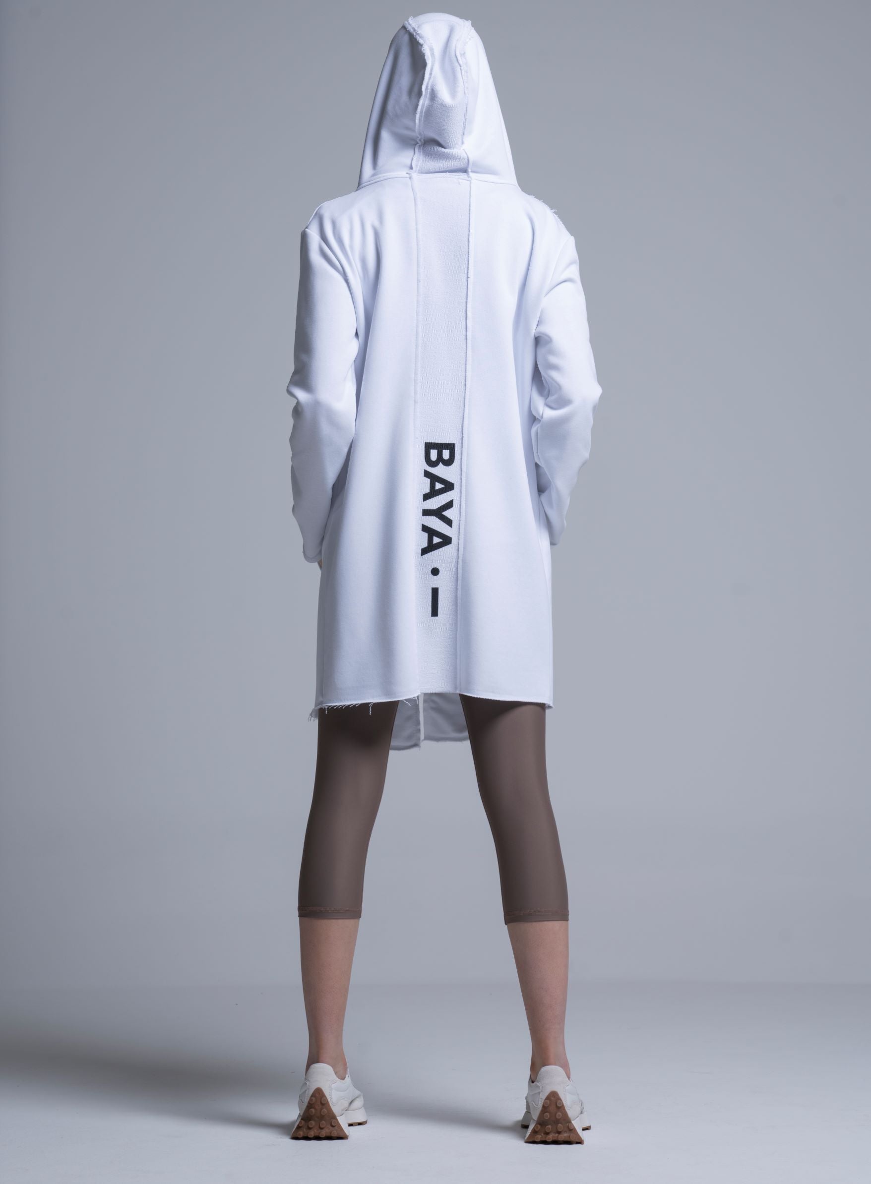 Unisex μακριά ζακέτα με κουκούλα. Λεπτομέρεια στο πίσω μέρος με τύπωμα "BAYA". Τσέπες στο πλάι.