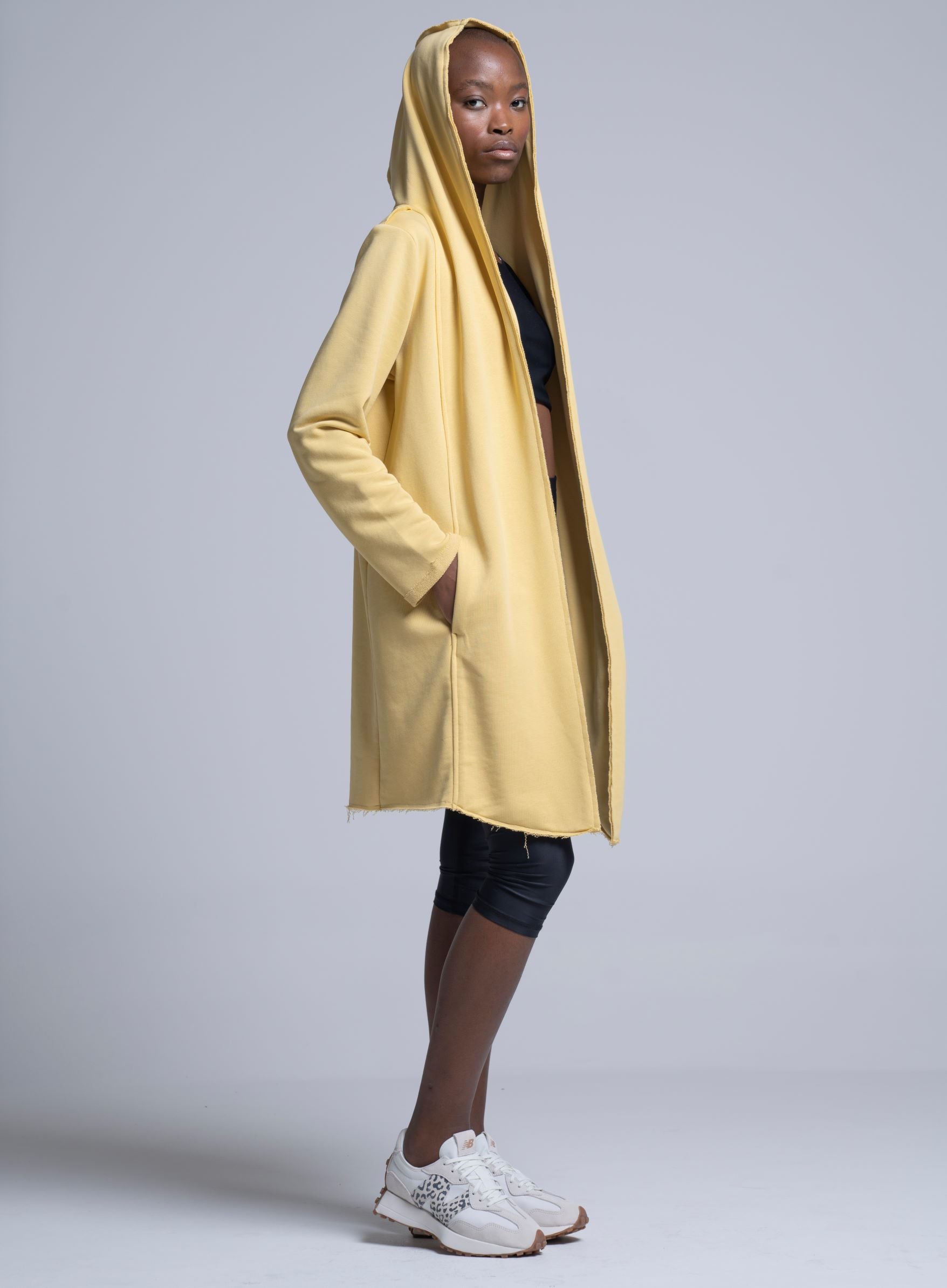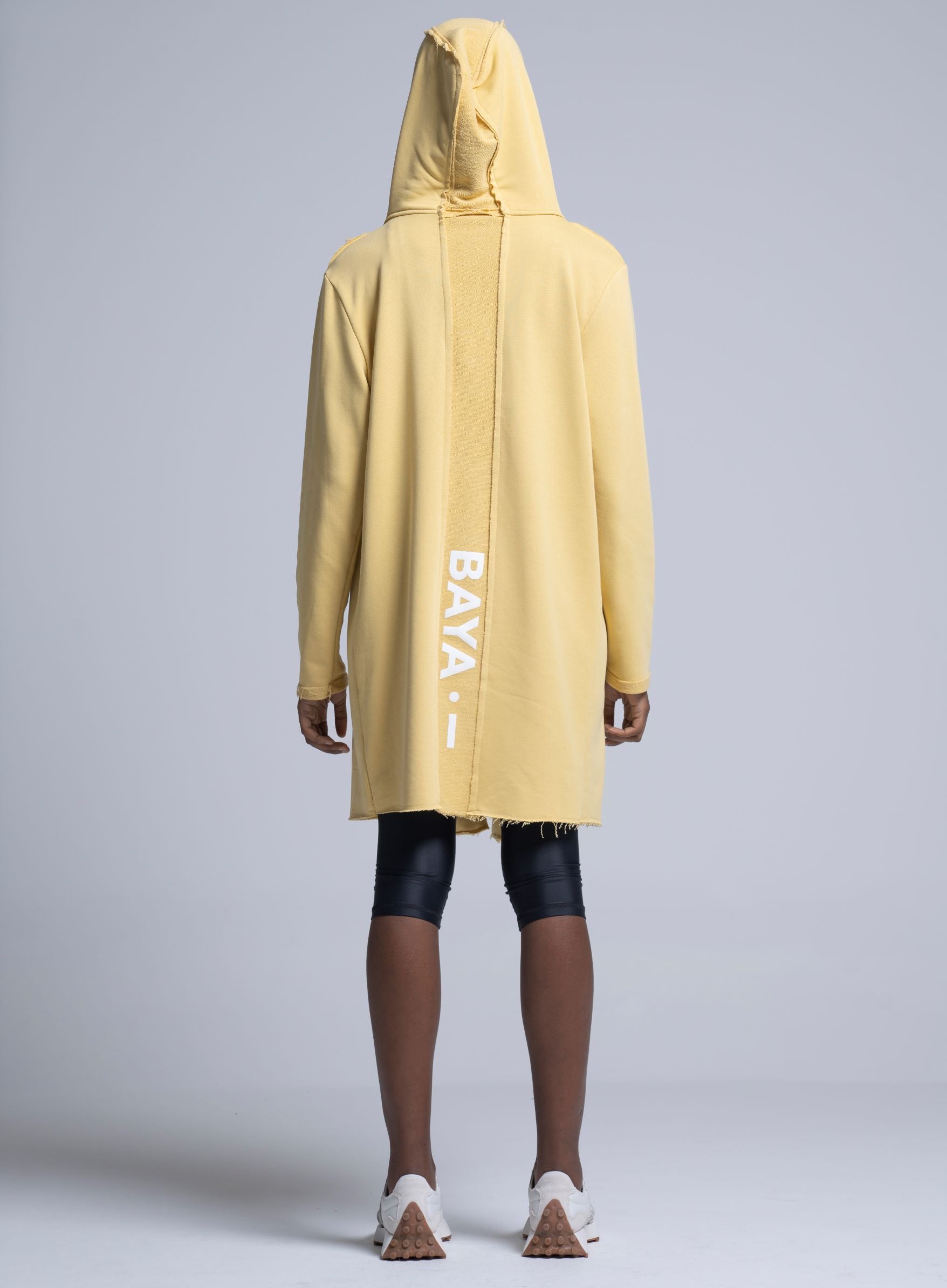 Unisex μακριά ζακέτα με κουκούλα. Λεπτομέρεια στο πίσω μέρος με τύπωμα "BAYA". Τσέπες στο πλάι.