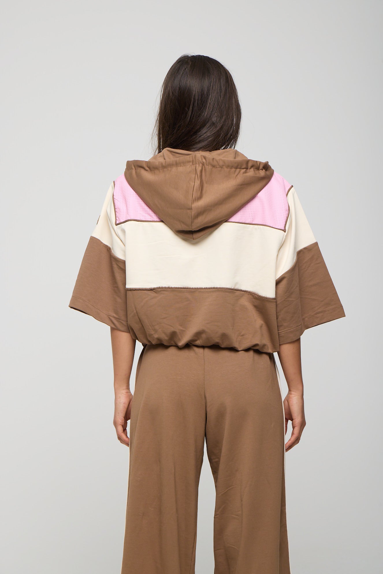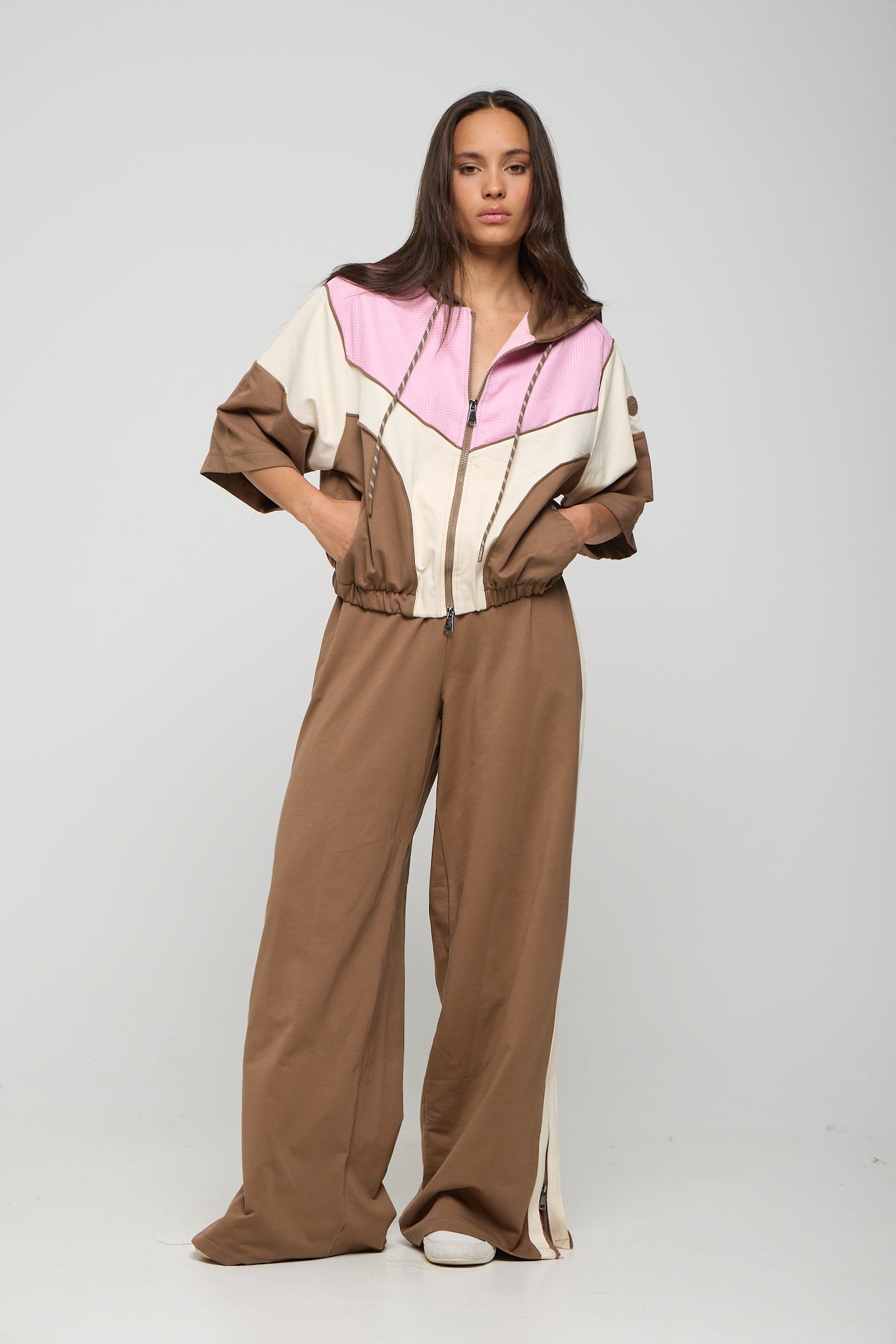 Κοντομάνικο τζάκετ με κουκούλα, φερμουάρ και colour blocking. Κουκούλα με ρυθμιζόμενο κορδόνι. 3/4 το μανίκι και λάστιχο τελείωμα. Oversized εφαρμογή. Παντελόνι φόρμας με κρυφό φερμουάρ στο πλάι για colour blocking εφέ με διάτρητο ύφασμα. Πωλούνται ως σετ και ΟΧΙ μεμονωμένα.