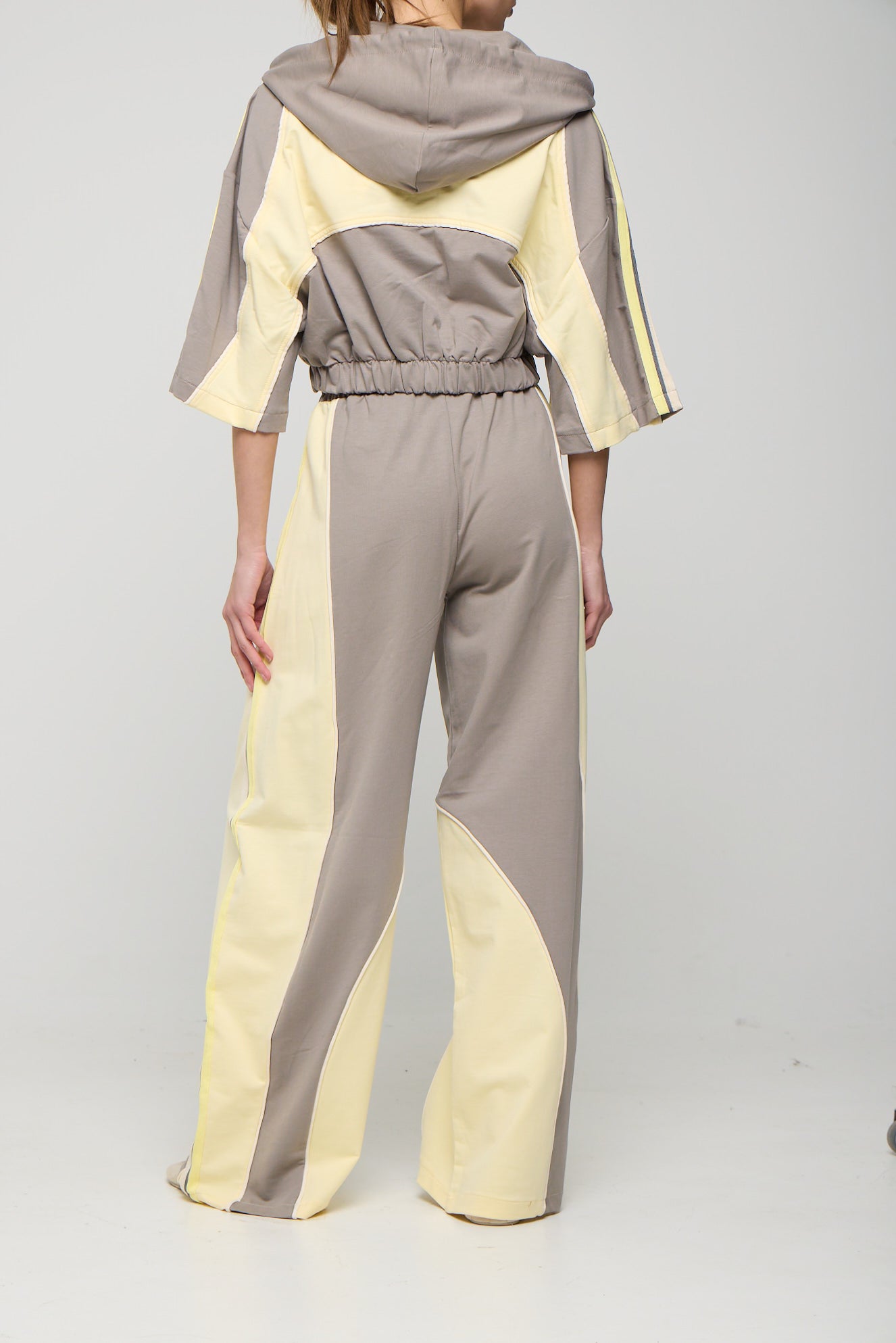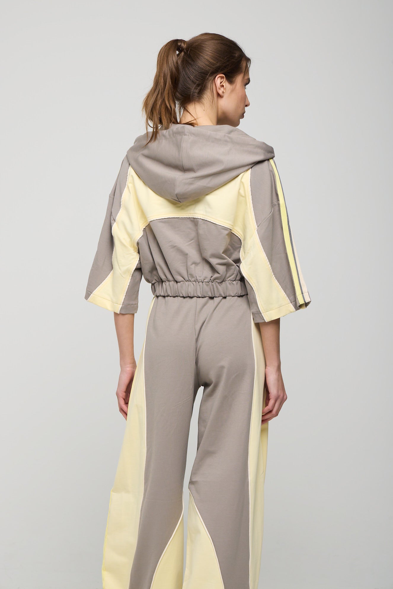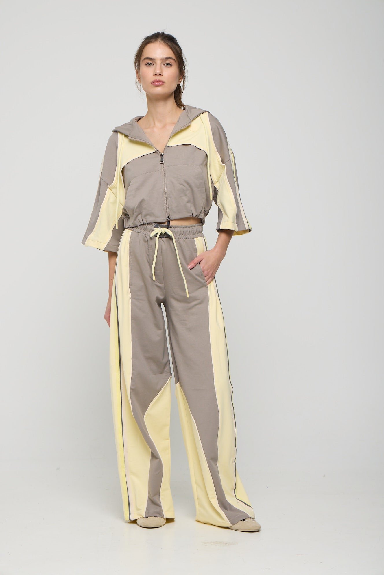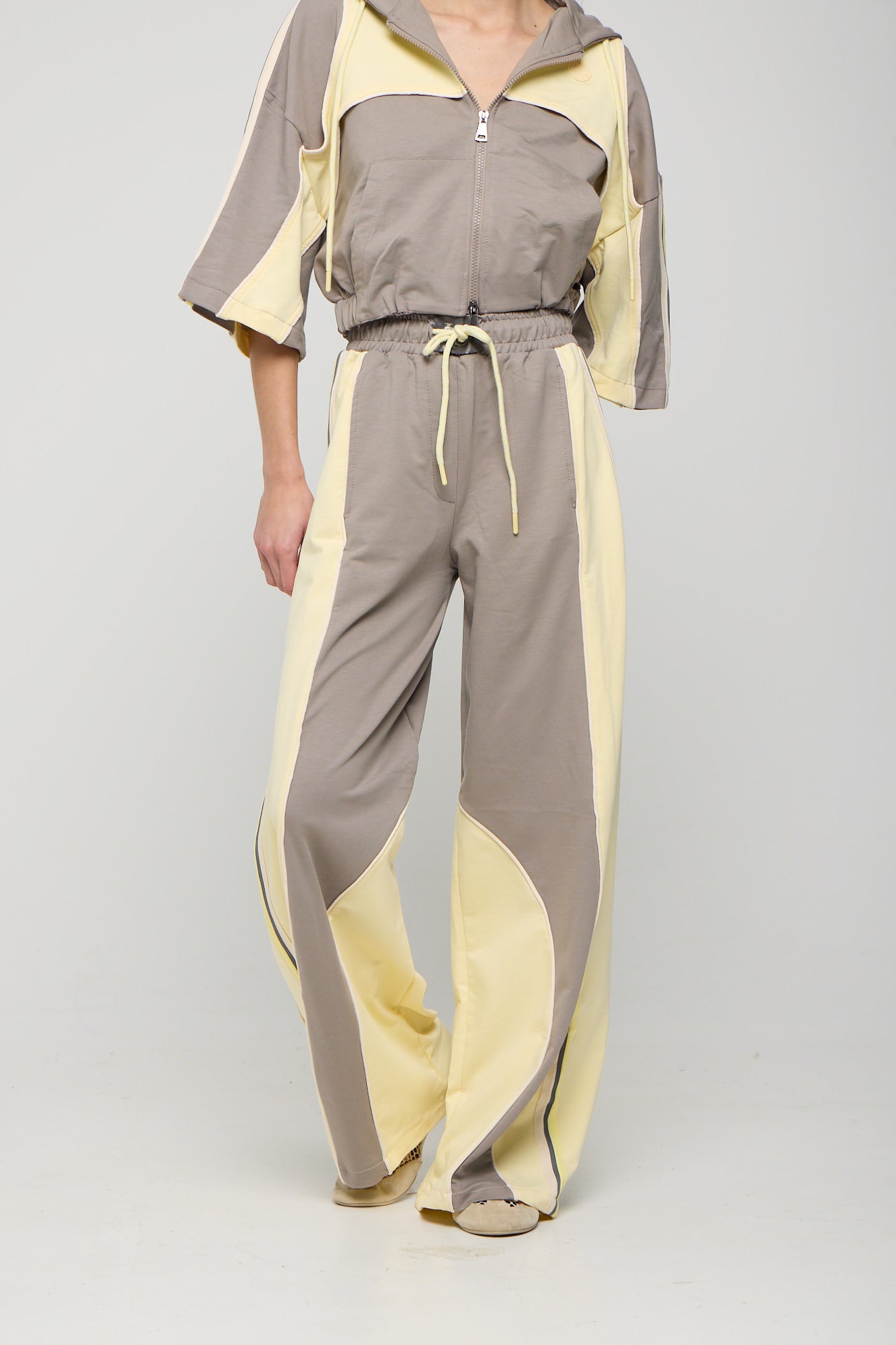 Κοντομάνικο τζάκετ με κουκούλα, φερμουάρ και colour blocking. Κουκούλα με ρυθμιζόμενο κορδόνι. 3/4 το μανίκι και λάστιχο τελείωμα. Oversized εφαρμογή. Παντελόνι φόρμας με colour blocking εφέ.