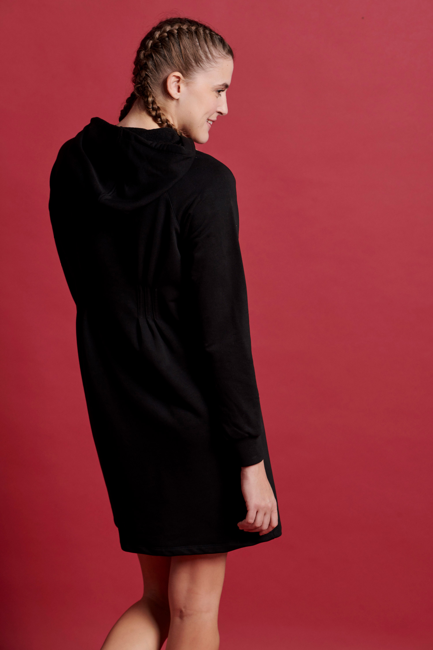 Αθλητικό φόρεμα φούτερ με κουκούλα με ρυθμιζόμενα κορδόνια. Φερμουαρ στη λαιμόκοψη και πιέτες στο μπροστινό μέρος. Διαθέτει τσέπες. Κανονική Εφαρμογή.