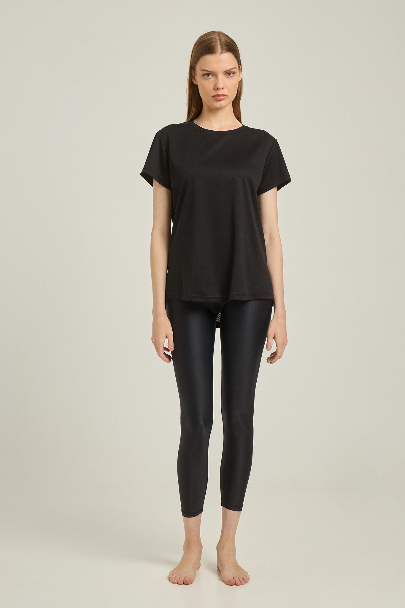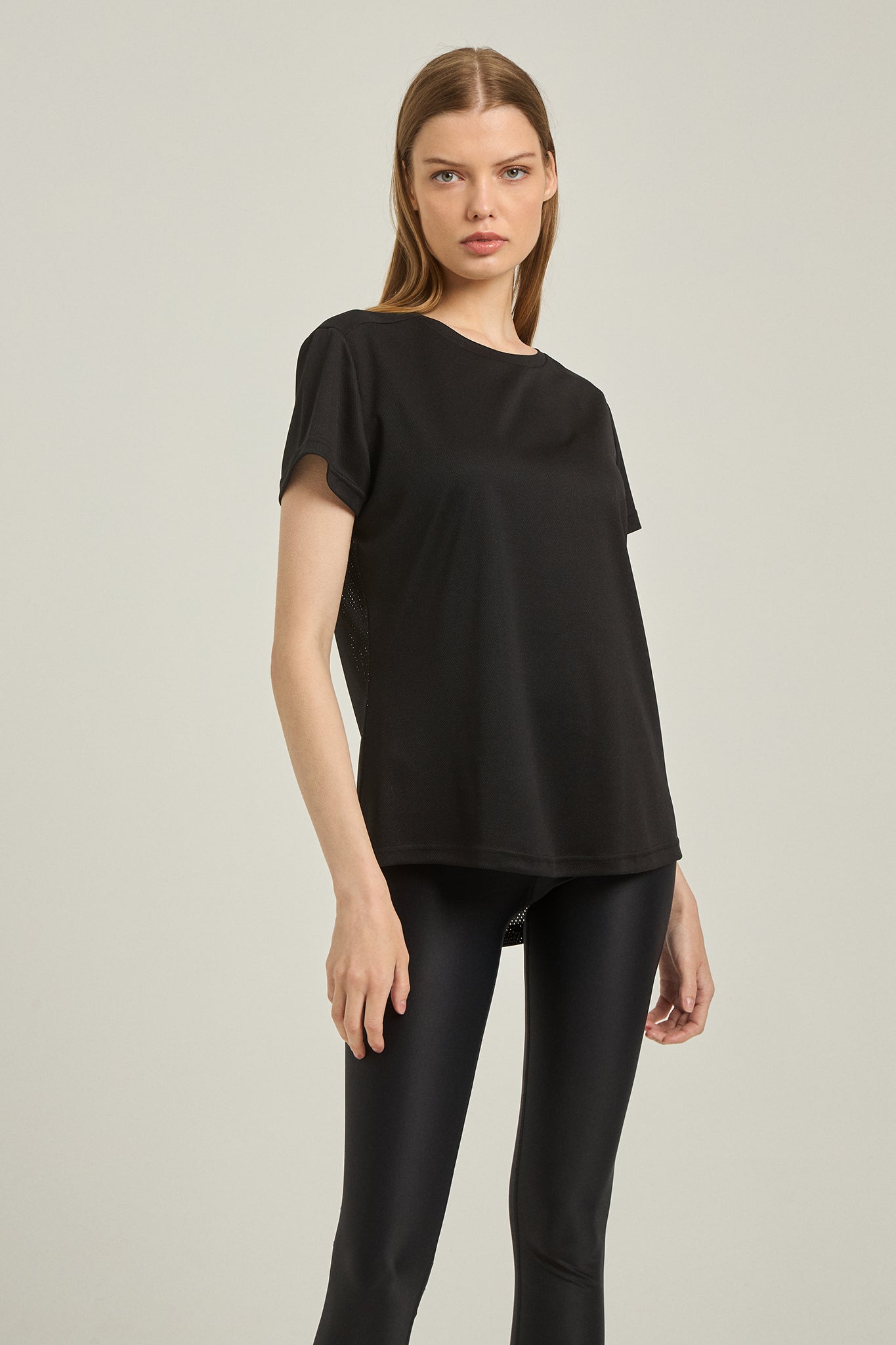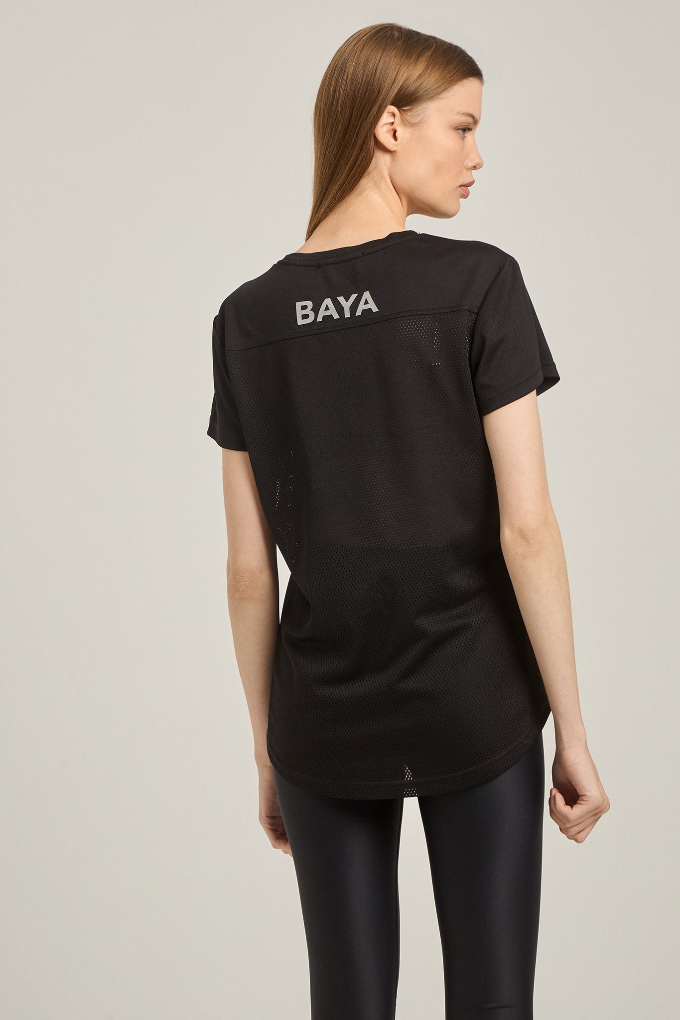 Κοντομάνικη αθλητική mesh μπλούζα με κλειστή στρογγυλή λαιμόκοψη και ασύμμετρο τελείωμα. Λεπτομέρεια reflective τύπωμα "BAYA" στο πίσω μέρος.