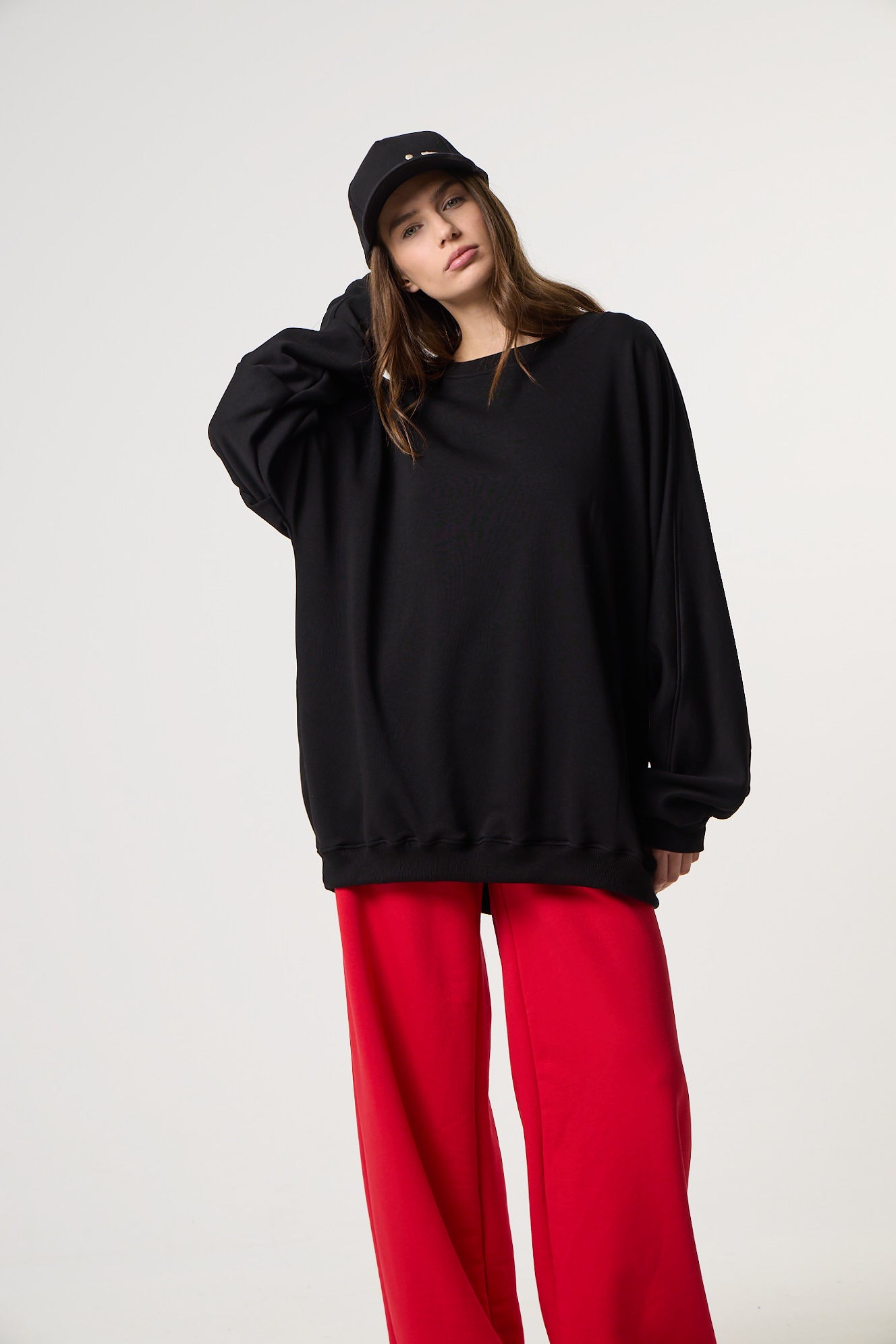 Oversized μακρύ φούτερ με λεπτομέρεια από πιέτες στο μανίκι. Κλειστή στρογγυλή ριπ λαιμόκοψη και λάστιχο στο τελείωμα.