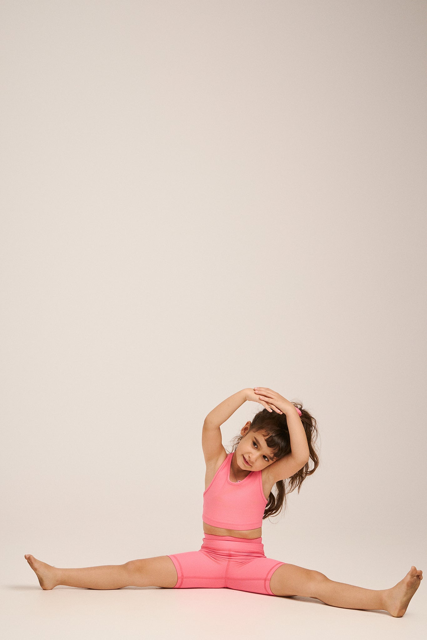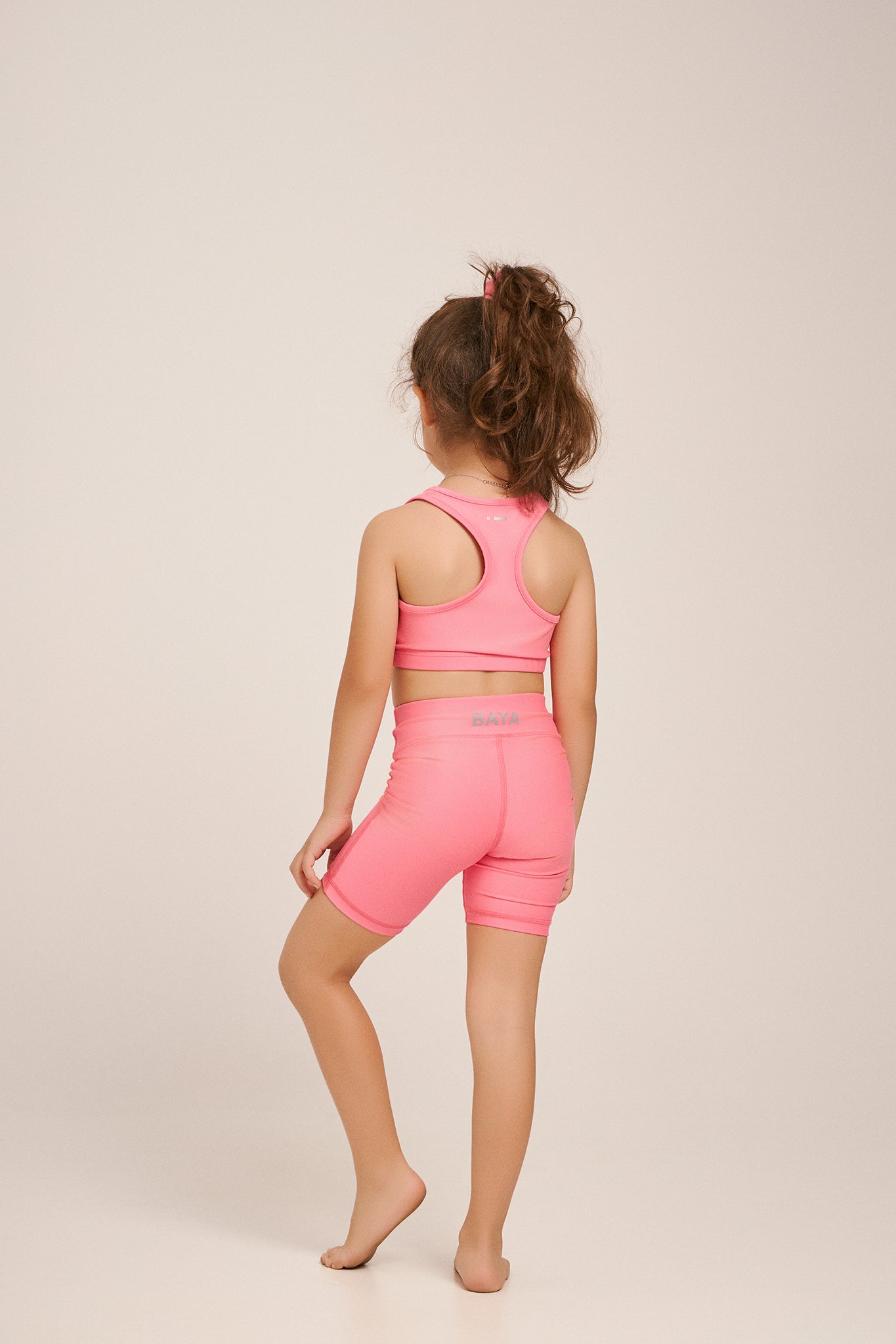 Top with round neckline and athletic back. High-waisted leggings with elastic waist.