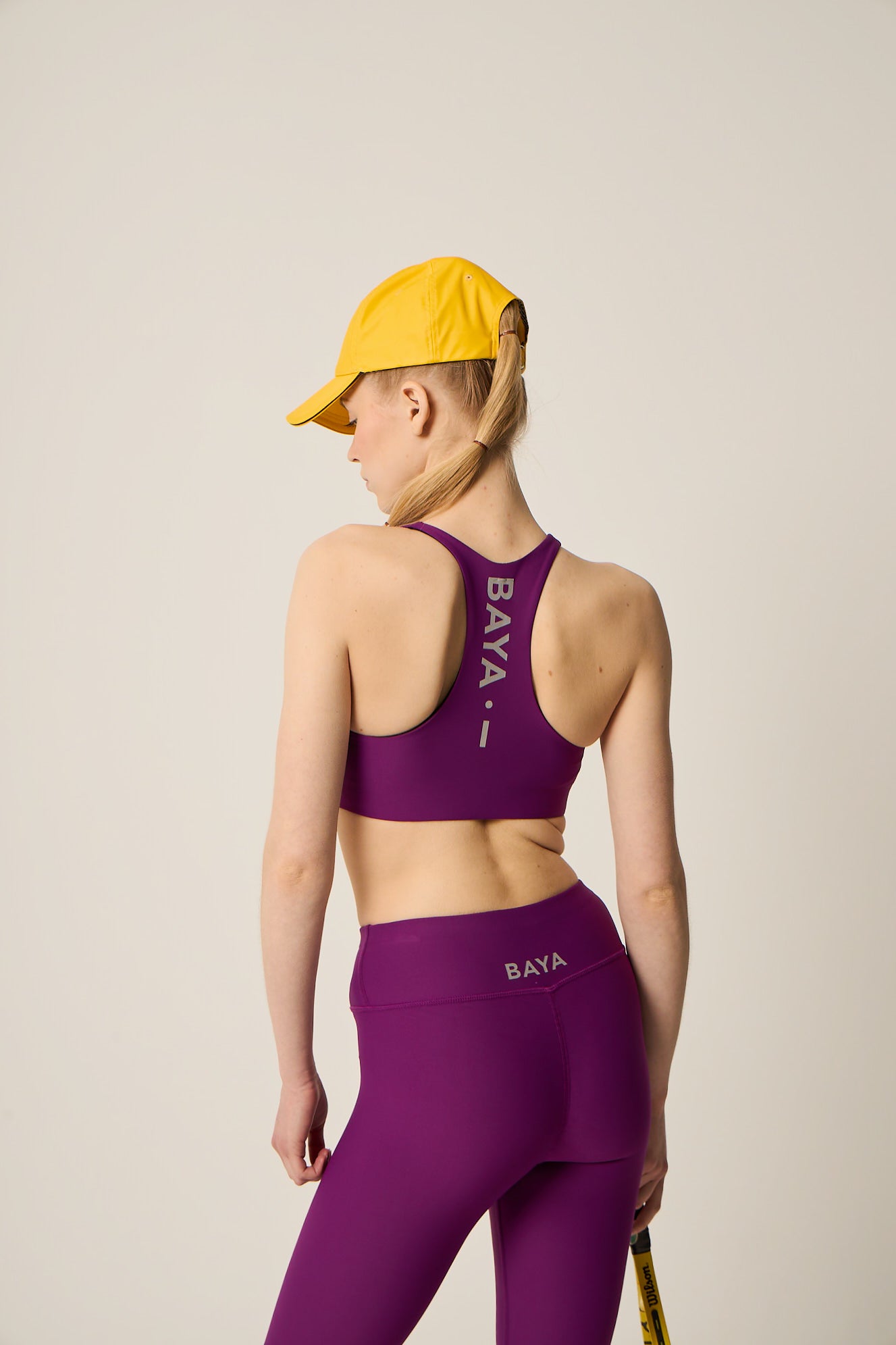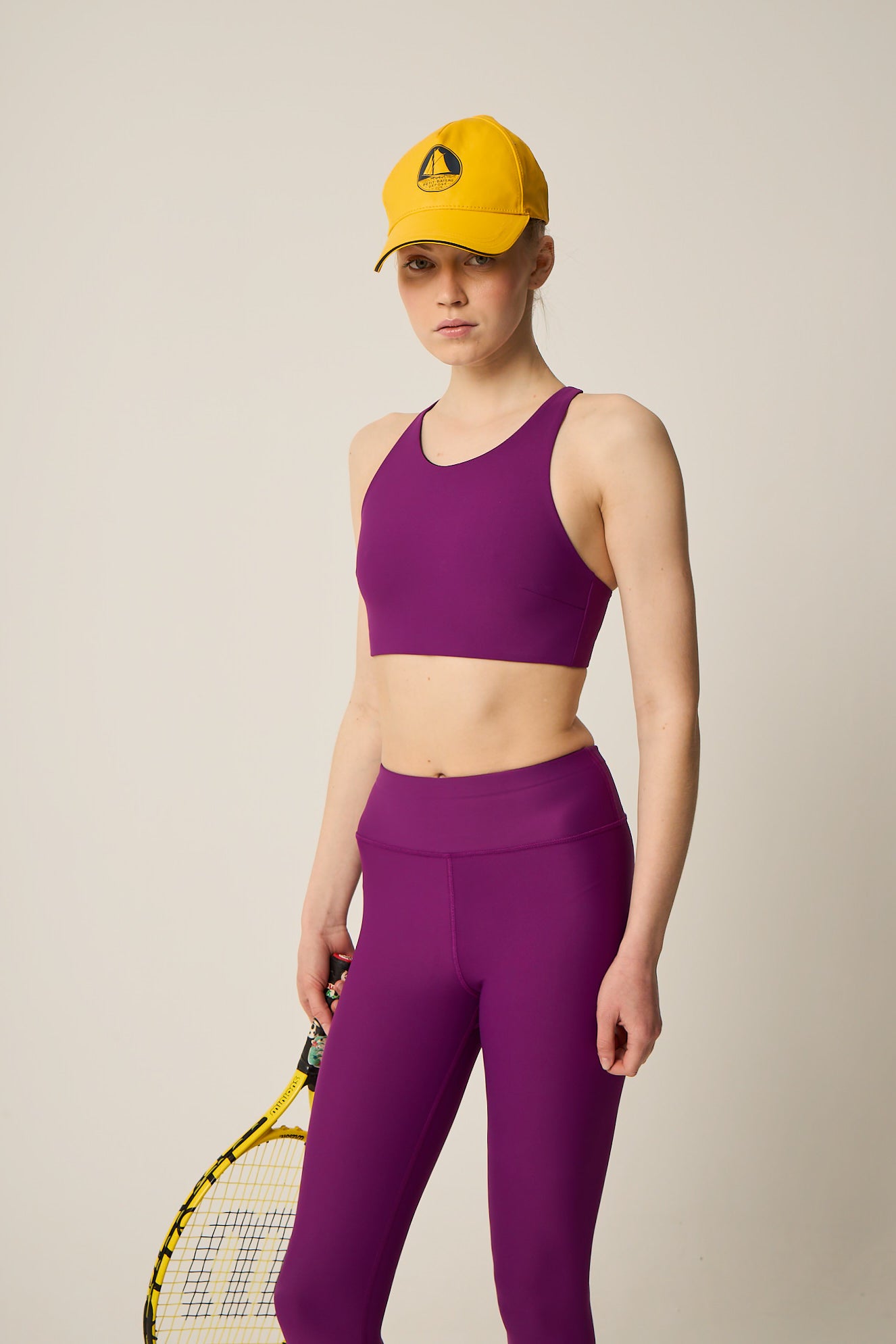 High-support top with elastic at the bottom and internal cups. Round neckline and sports back.