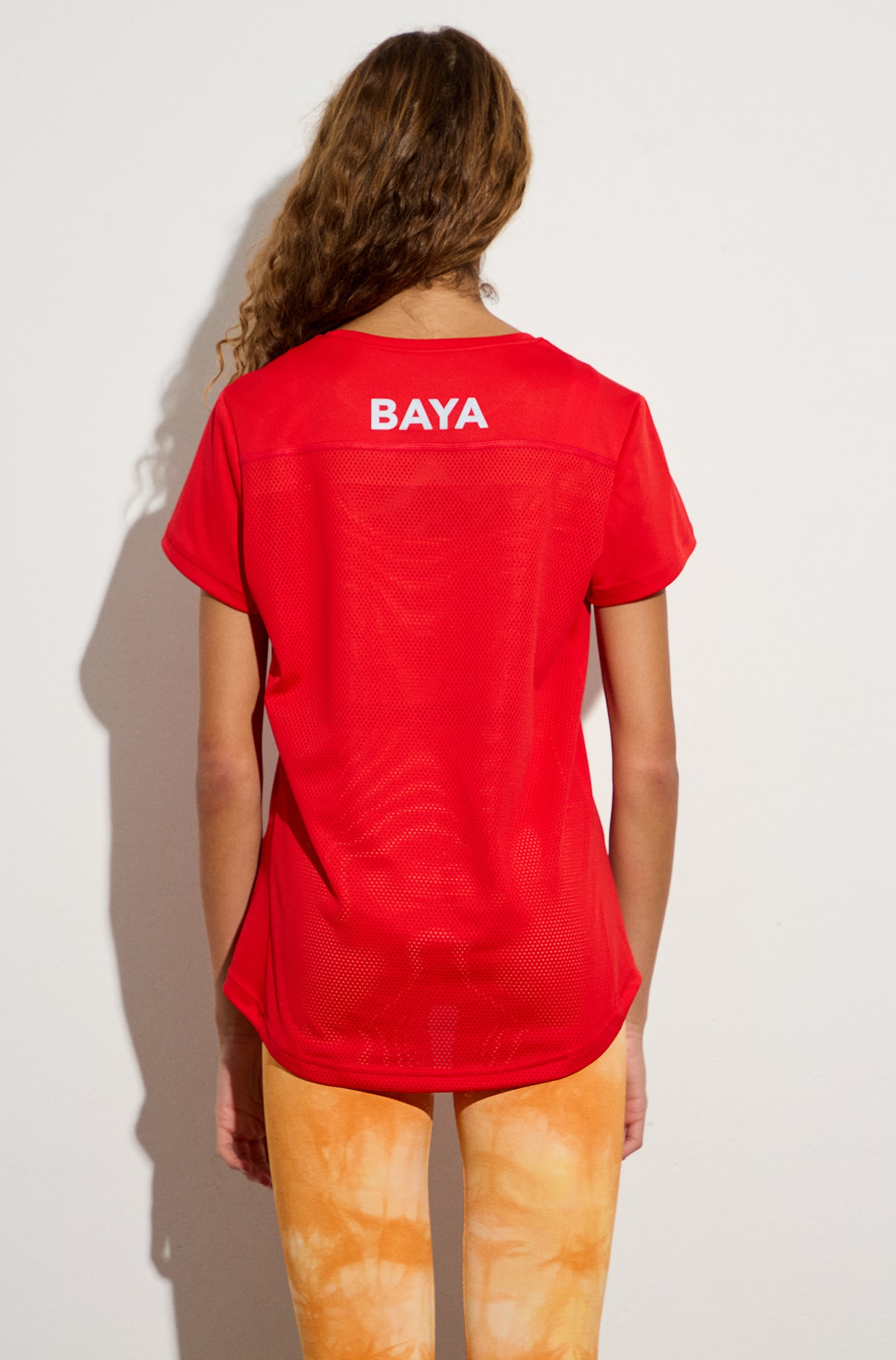 Short-sleeved sports mesh top with a closed round neckline and asymmetrical hem. Reflective "BAYA" print detail on the back.