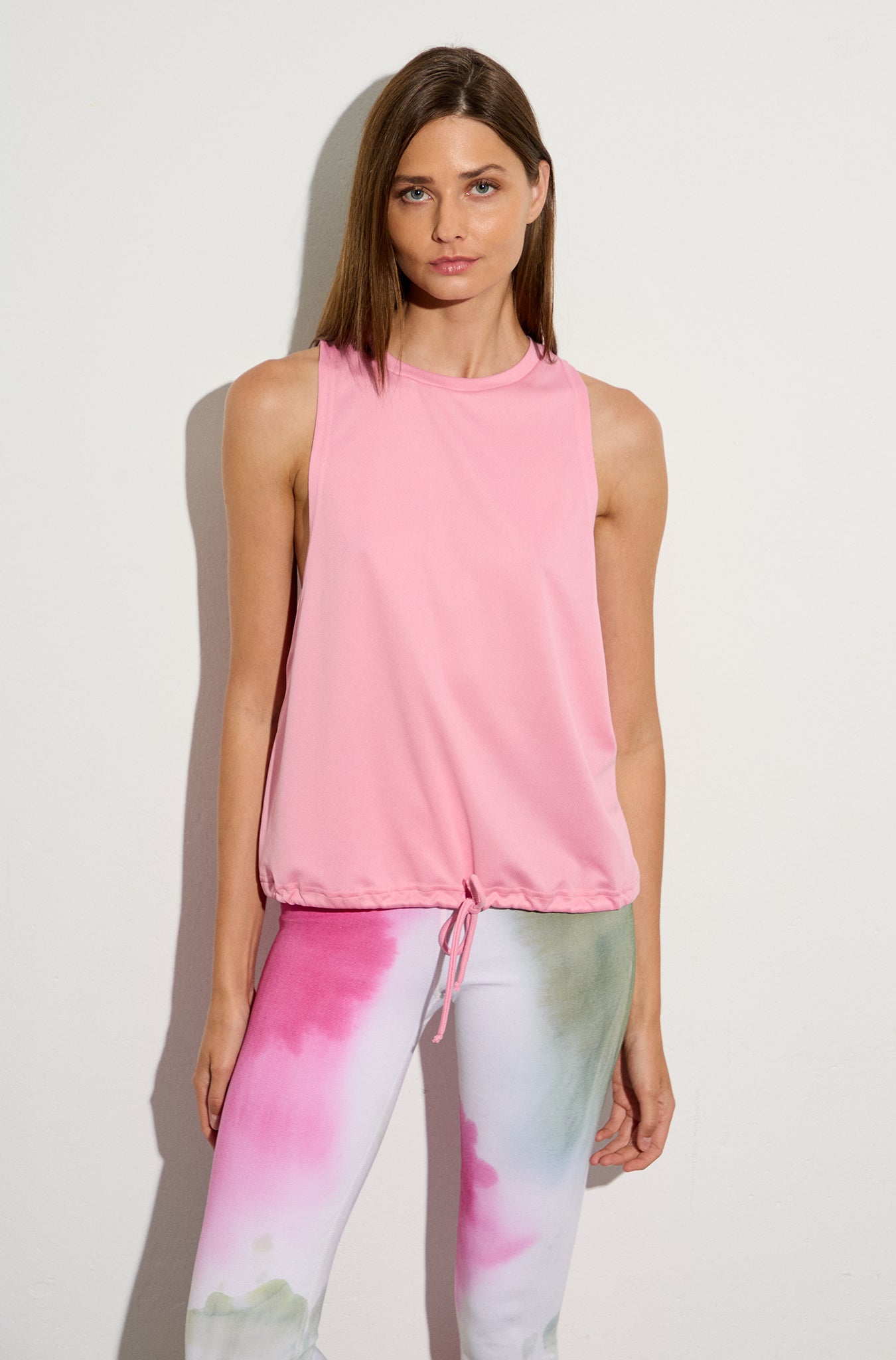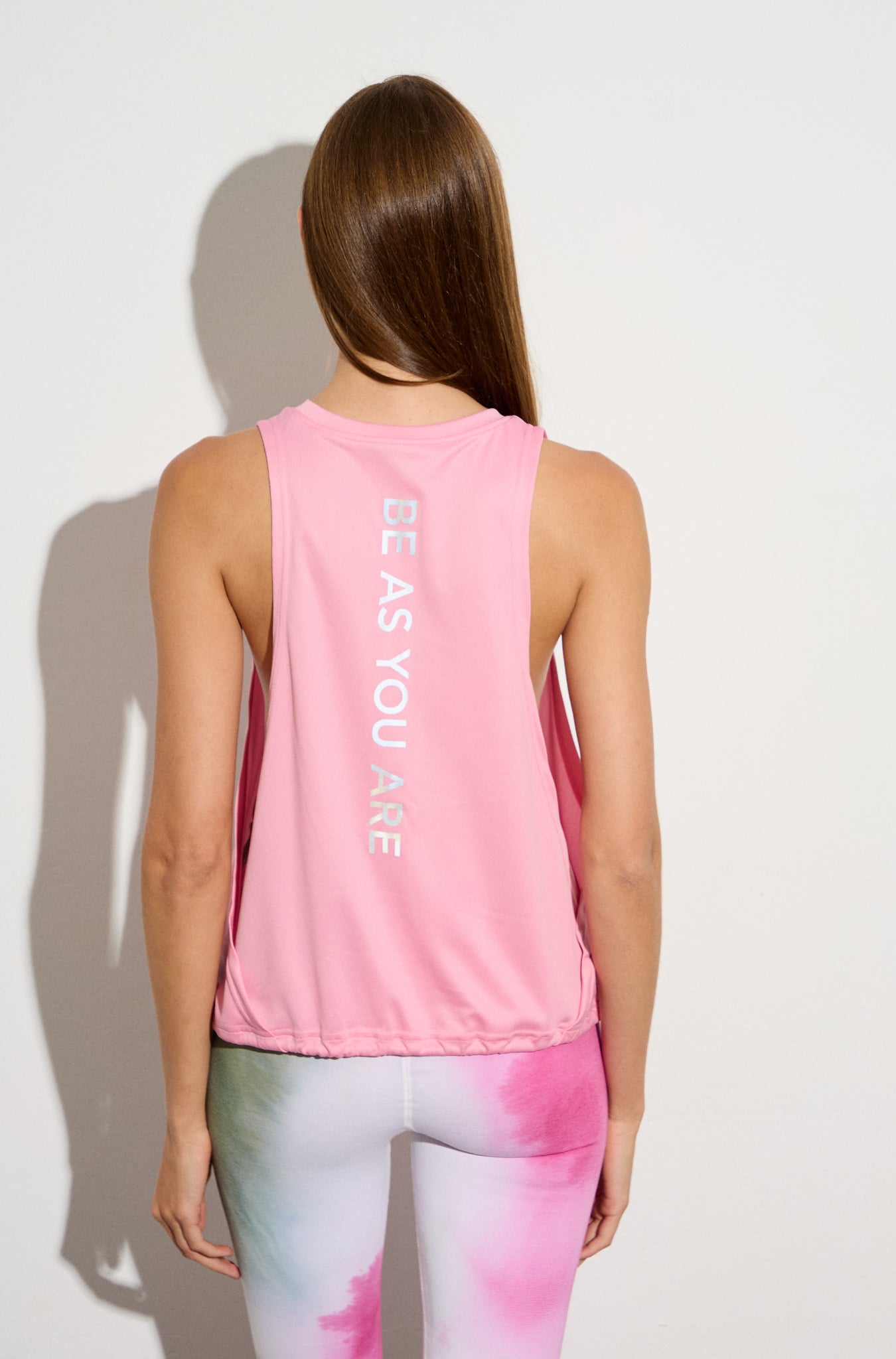 Sleeveless sports mesh top with a closed round neckline and ruched hem. Reflective "BE AS YOU ARE" print detail on the back.
