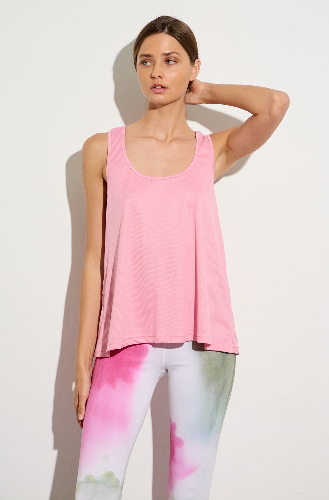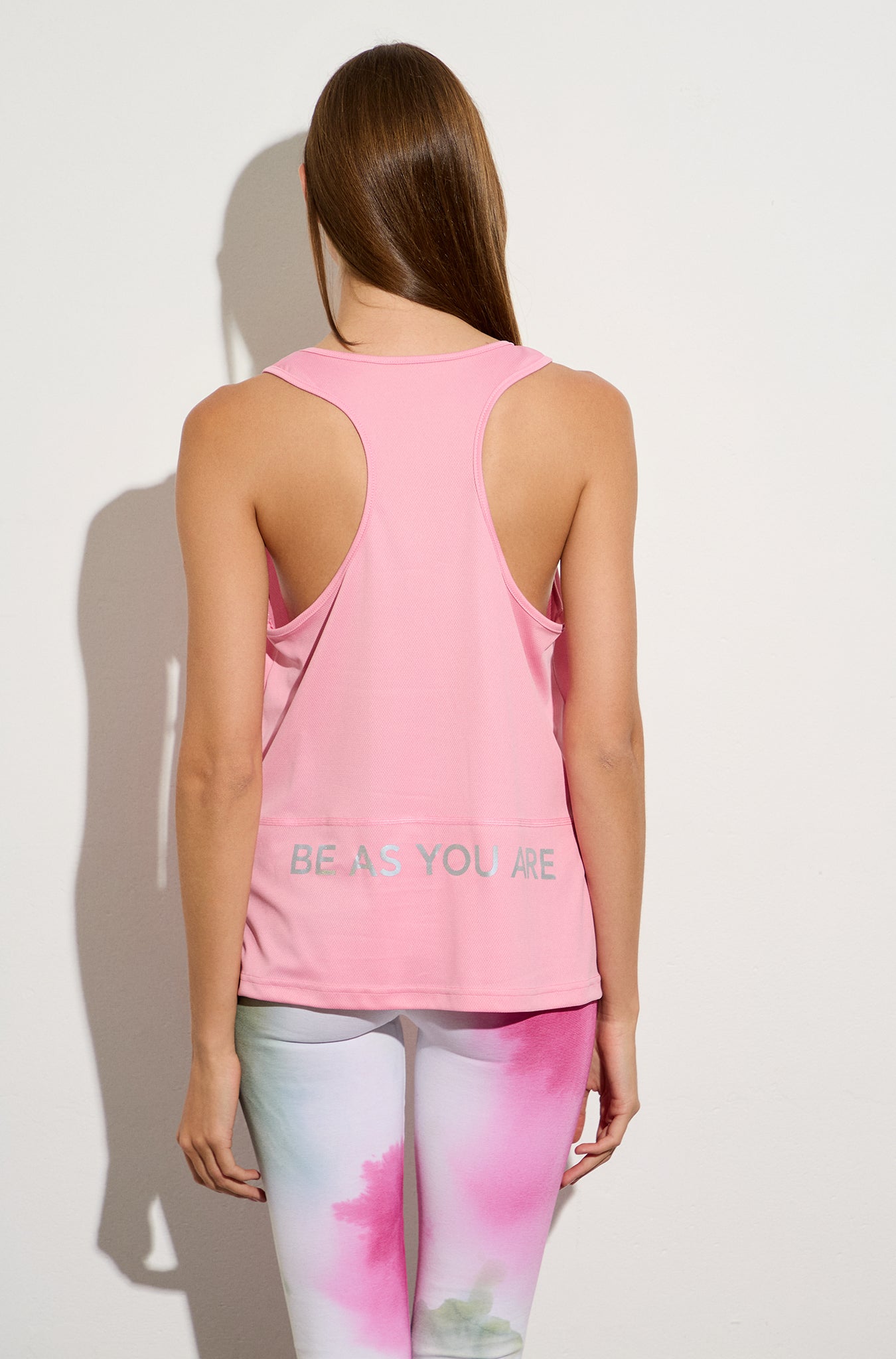 Sleeveless sports mesh top with open round neckline and asymmetrical hem. Reflective "Be as you are" print detail on the back.