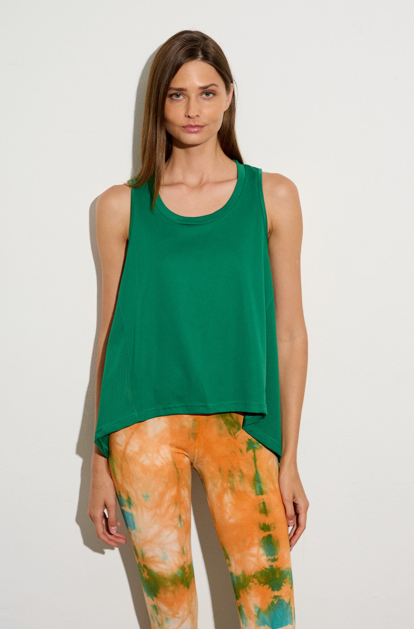 Athletic mesh top with a closed round neckline and asymmetrical hem. Reflective "BAYA" print detail on the back.