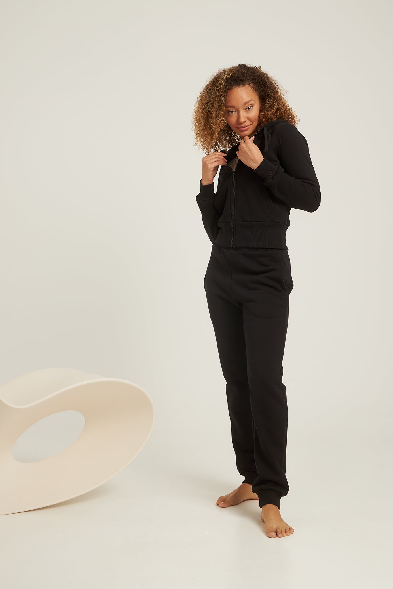 Hooded sweatshirt with zipper. Print on the back. Tracksuit pants with hidden side pockets. Elastic and adjustable drawstring at the waist with "BE AS YOU ARE" print along the length of the drawstring. Elastic at the hem. "BAYA" print next to the left pocket.
