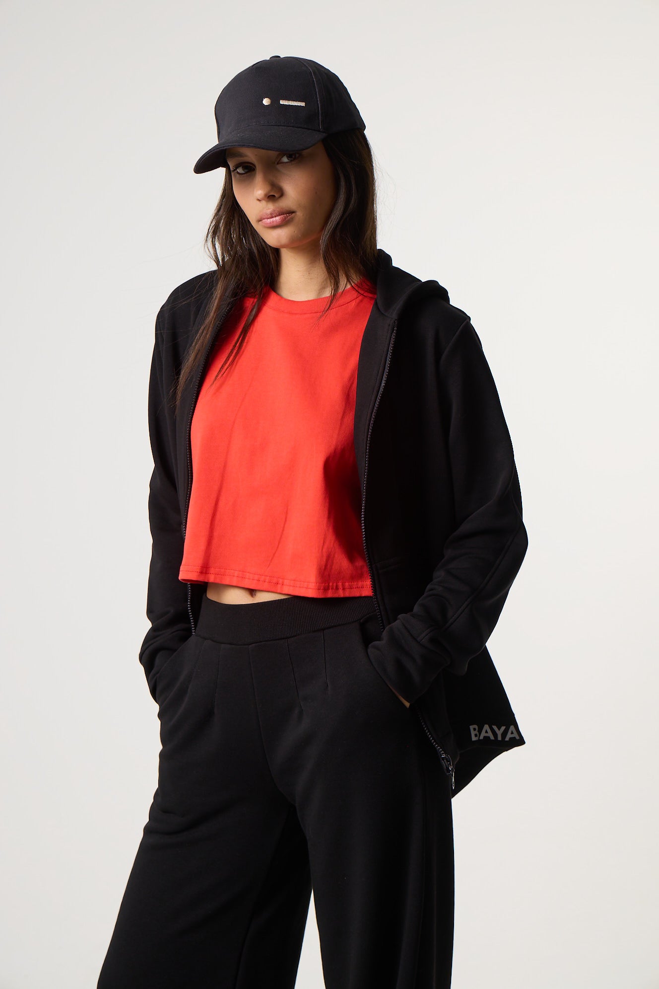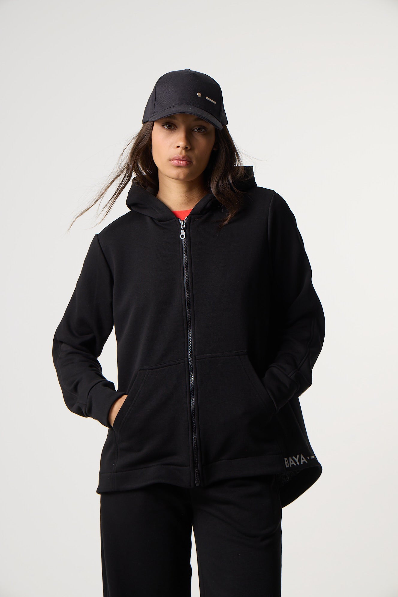 Hooded jacket with adjustable drawstrings. Asymmetrical hem and regular fit.