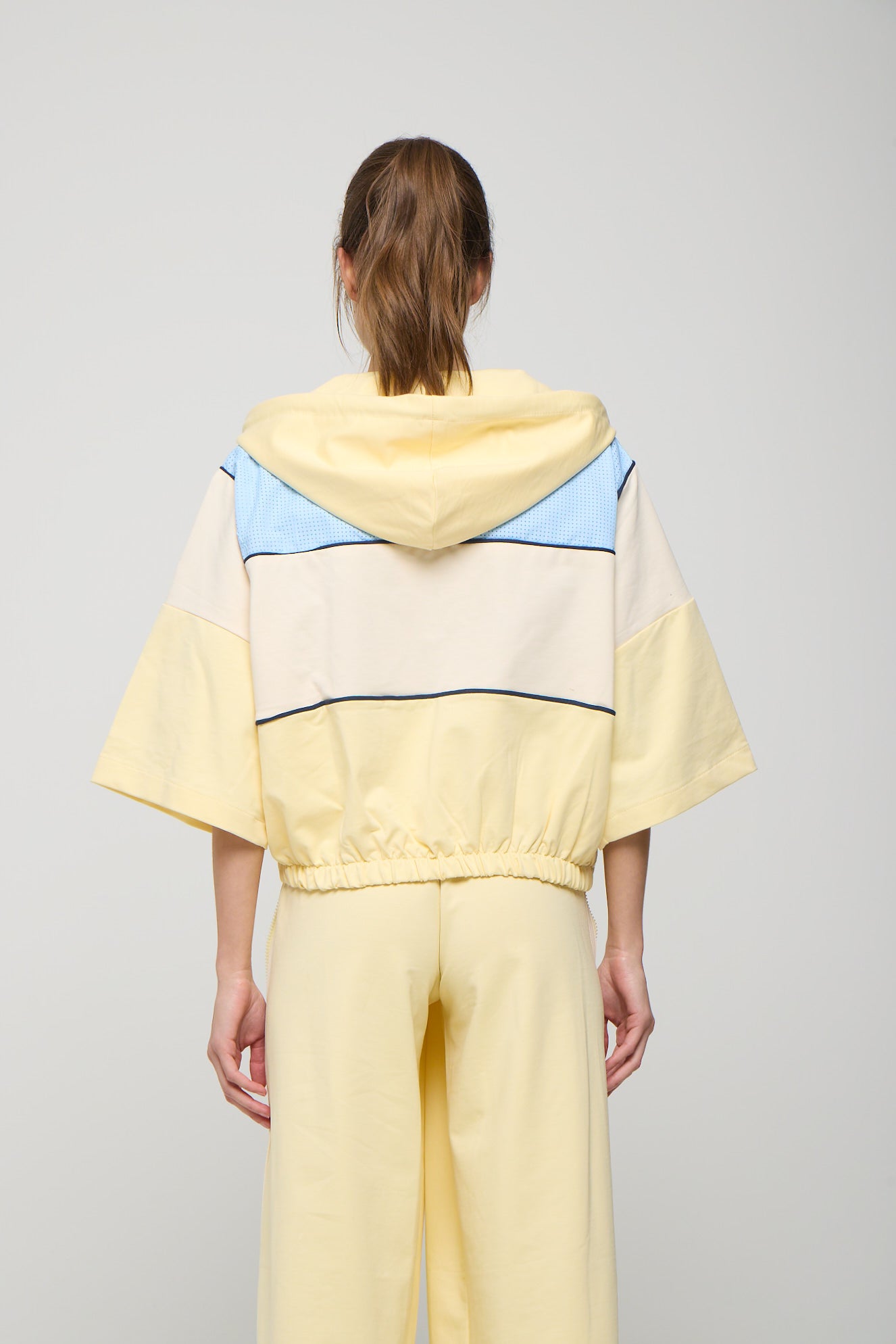 Hooded jacket with adjustable drawstrings. Asymmetrical hem and regular fit.
