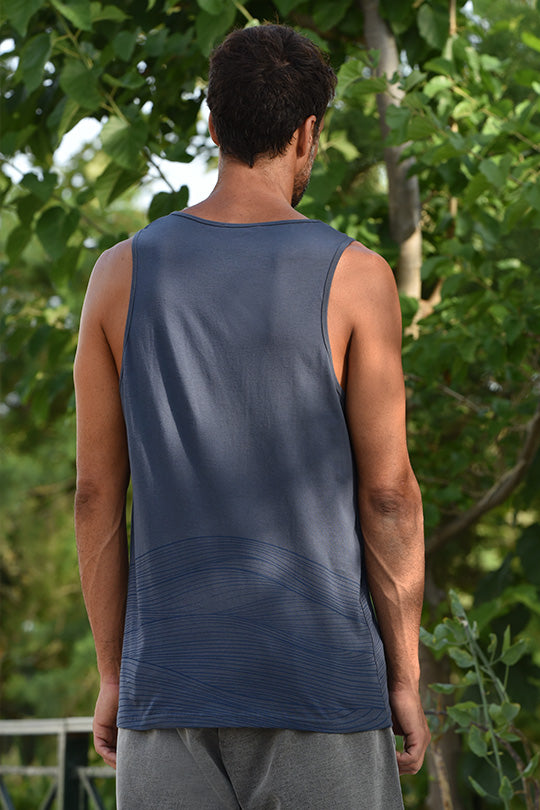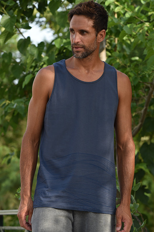 Αμάνικη, ανδρική μπλούζα με στρογγυλή λαιμόκοψη από 100% οργανικό βαμβάκι. Mοναδικό κυματιστό print στο τελείωμα και σε χαλαρή εφαρμογή. Τύπωμα "BAYA by Ioannis Drymonakos" στο κάτω μέρος.
